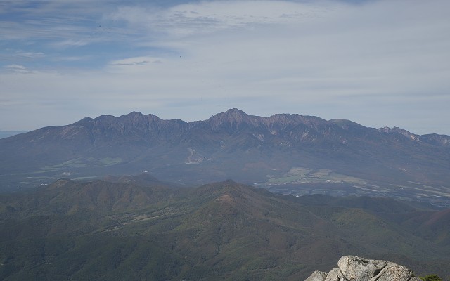 山頂の岩の上にやって来ました。すばらしい展望でした。まず目の前に大きく連なる八ヶ岳連峰です。一際高いのが赤岳です。