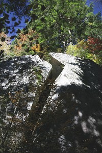 山腹から急斜面を沢まで降りてきました。沢を渡って、これからみずがき山へ登ります。目の前にあった綺麗にひび割れた大岩です。