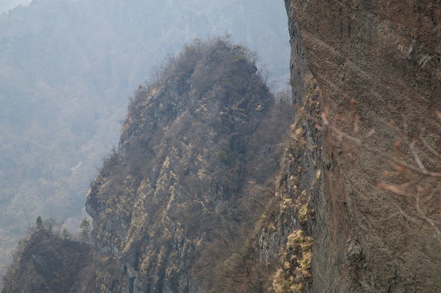 少し登ってこの石門は鎖を頼りに幅の狭いところを上り、下ります。この日の山行初めての鎖です。このあたりの岩はどれも、大地震でもあれば崩れてしまいそうに岩の上に乗っかっています。私が登ったら傾くのではないかと不安になるほどです。