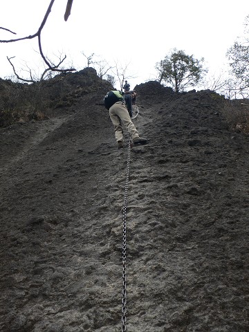 白雲山で腹ごしらえを終えると、ピークを結ぶ狭い尾根を下って行きます。最初の長い鎖場です。垂直に見えるこの壁、表面がざらざらしているものの、足を置く岩の出っ張りがありません。ただひたすら足を岩壁につっぱるようにして登っていきます。