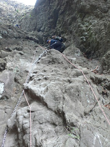 先ほどの長い鎖場を登ってほっとしたのもつかの間、今度はこれも垂直に見える岩壁の下りです。初めてロープで確保してもらい降りて行きます。