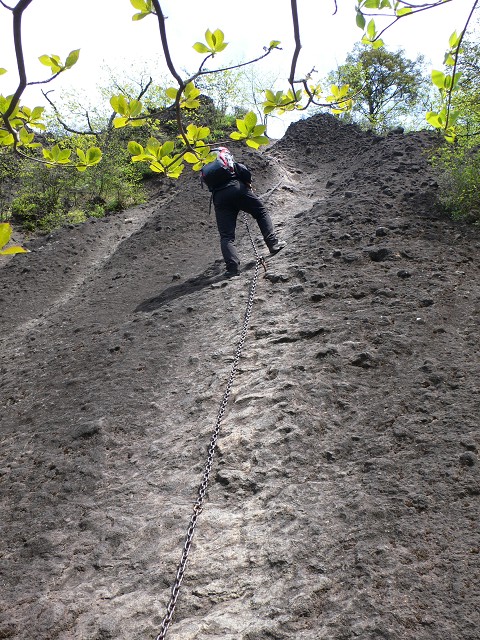 最初にある垂直の壁、長い鎖場です。手や足のホールドはありません。鎖と靴底の摩擦で登って行きます。登っているのはダンナさん。