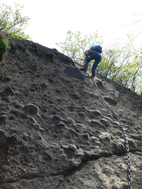 稜線上は鎖場のアップダウンが続きます。ここも垂直に近く長い鎖場です。石門のところで出会った単独の方、今回ずっと一緒に歩いてくださいました、その方が下りてきます。