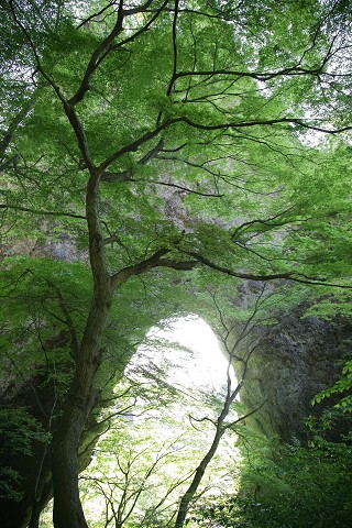 見上げるほど大きな石門をくぐりながら登って行きます。新緑に彩られた大きなアーチ、目をみはるほど不思議な形をしています。