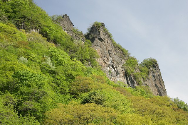 最後の石門を抜けて、大砲岩や胎内くぐりと名のついた岩のあるところにやってきました。そこから見上げる金洞山です。辺り一面新緑で眩しいくらいです。この金洞山には長い鎖場のある危険箇所がありますので、私たちは隣の白雲山を目指します。