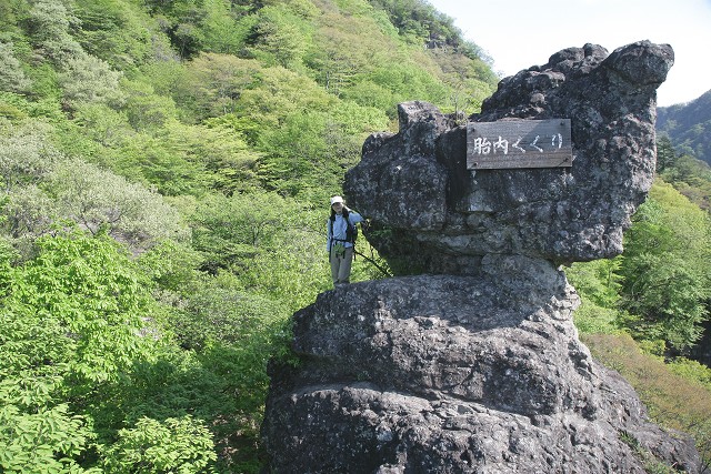 今にも落ちそうな大きな奇岩が並んでいます。そのひとつ、胎内くぐり、岩に大きな穴が開いていて、くぐることができます。以前に来た時は何も考えずにくぐったのですけど、今回は足元の絶壁を考えると怖くなってしまい、くぐるのは止めておきました。