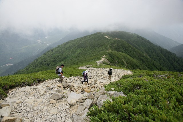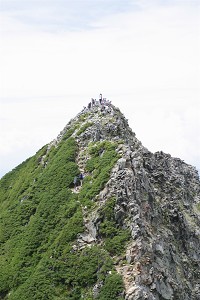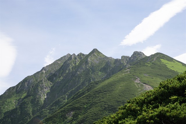 これから行く稜線です。緑のハイマツ帯を登って行くと、独標から頂までは高度感ある岩稜帯のアップダウンが続きます。