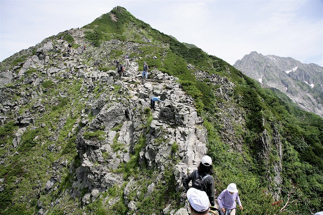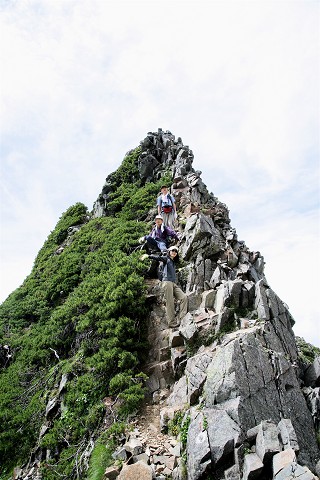 独標を下っていくつか小さいピークを越えてこの尖ったピラミッドピークへ登って行くところです。数人のパーティーが下りてきますので、こちらの安全なところで待っている私たちです。