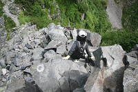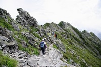 山頂を後に戻ります。飛騨側が切れ落ちた稜線はつり尾根にそっくりです。岩を上ったり下ったり、アップダウンを繰り返します。