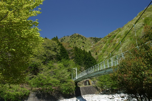 西丹沢にかかるつり橋と新緑