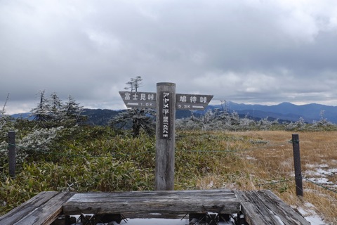 アヤメ平の端にあった道しるべ、標高が意外を高く1960mもありました。鳩待峠から標高差300m以上登ってきたみたいです。