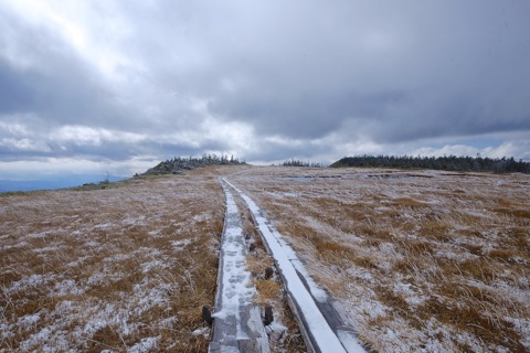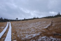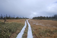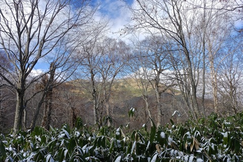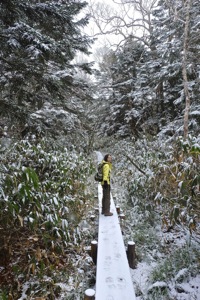 鳩待峠から少し登ってきました。峠から登山道には夕べ積もった雪が数センチ、木道に入ってからはとても滑り易く、軽アイゼンを持っていなかったことを後悔しながら、滑らないようにヨチヨチ歩きの連続でした。