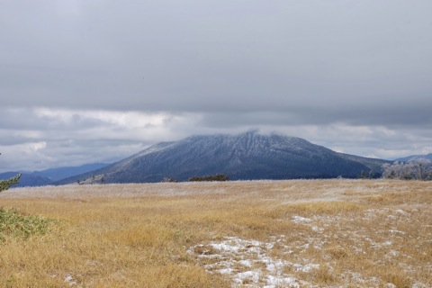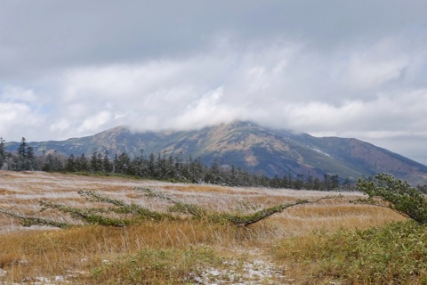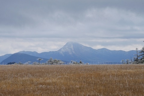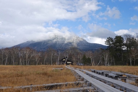 竜宮十字路から燧ヶ岳。誰もいないベンチでおにぎりを食べましたが、風が通り抜ける広い原っぱの寒かったこと。