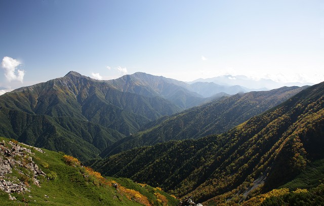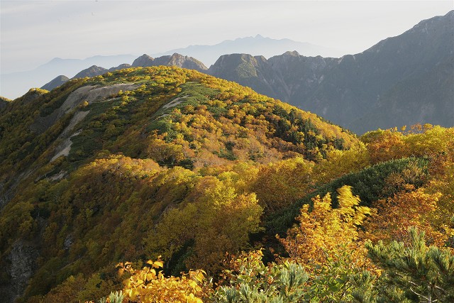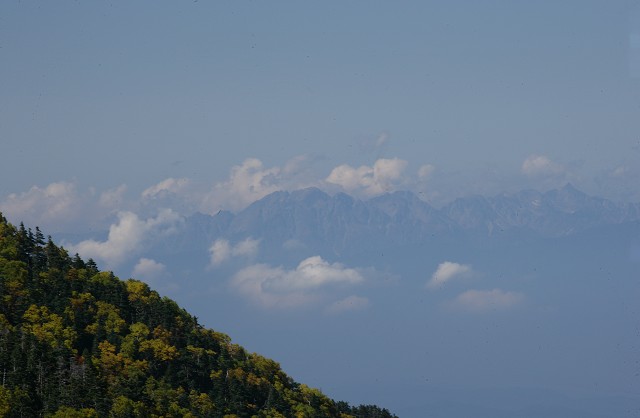 馬の背付近のダケカンバの黄葉もすばらしく、小さく中央アルプスの宝剣岳付近が見えていました。
