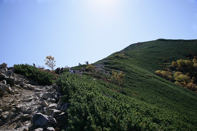 小仙丈へハイマツ帯の急登を行きます。稜線に出ると、仙丈ヶ岳が迎えてくれる筈、頑張ります。