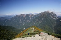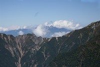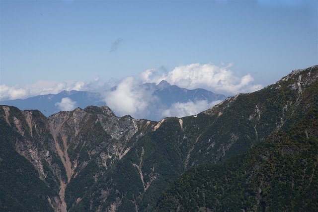 周りが開けてくると、遠くに北アルプスを望むことができました。槍から大キレットを経て穂高へ連なっています。