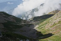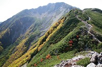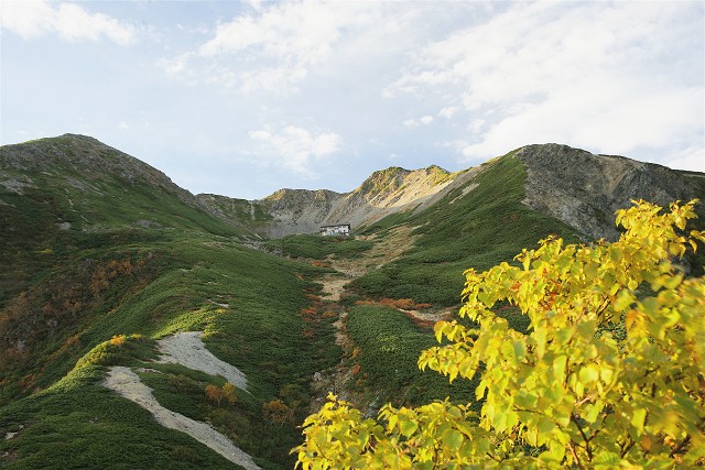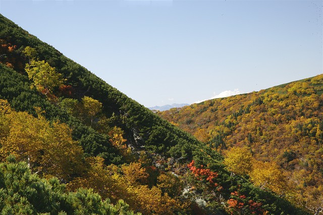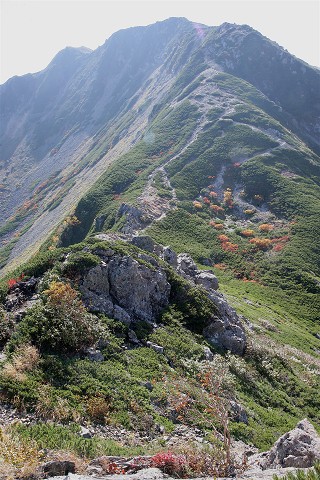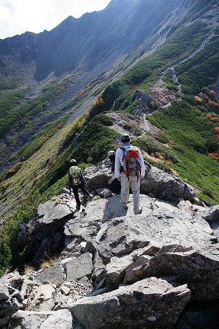 ナナカマドの紅葉とダケカンバの黄葉の中を下ります。見上げるとさっきまでいた小屋のあるカールにも太陽の光が射していました。