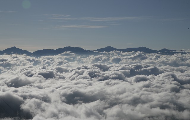 早朝のバス、ロープウェイを利用して標高2600mの千畳敷にやってきました。目の前に広がる雲海の先に南アルプスの山々が綺麗でした。