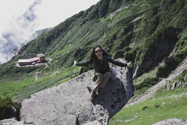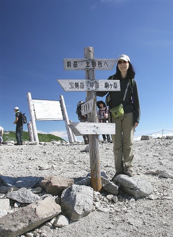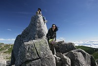 宝剣頂の岩の前に立つ私です。岩の上には二人の小さい先客がいて展望を楽しんでいました。