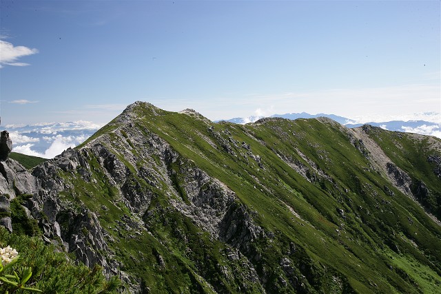 乗越浄土から反対側の稜線が綺麗です。去年ルートを間違ってここを往復したことがあります。緑に覆われた素敵な稜線で、ウスユキソウも咲いていました。