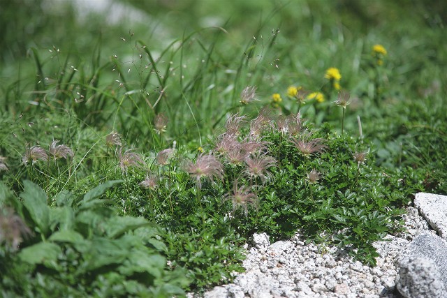稜線を離れ、分岐を下りて行くと、あたりは一面のチングルマ畑、嬉しい私でした。一箇所だけ写真のようにもう咲き終わって風車のような果穂をつけていました。