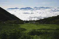 チングルマ、コバイケイソウ、ミヤマキンポウゲ、シナノキンバイなどが咲いていました。少し登って振り返ると眼下にカールと南アルプスが雲海に浮かんでいました。