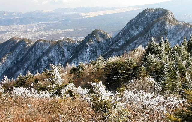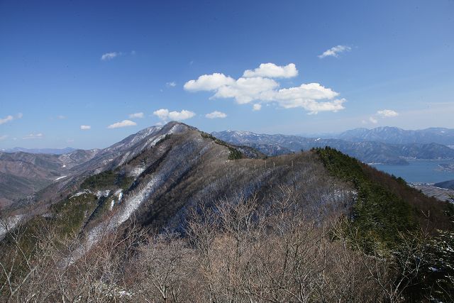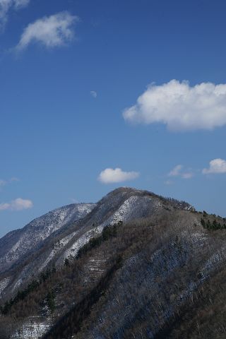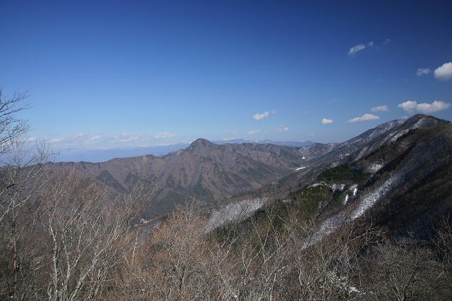 同じところから奥秩父方面の展望です。目の前の尖った山は釈迦ヶ岳、その向こうに薄らと雪化粧をした秩父の山々が見えています。