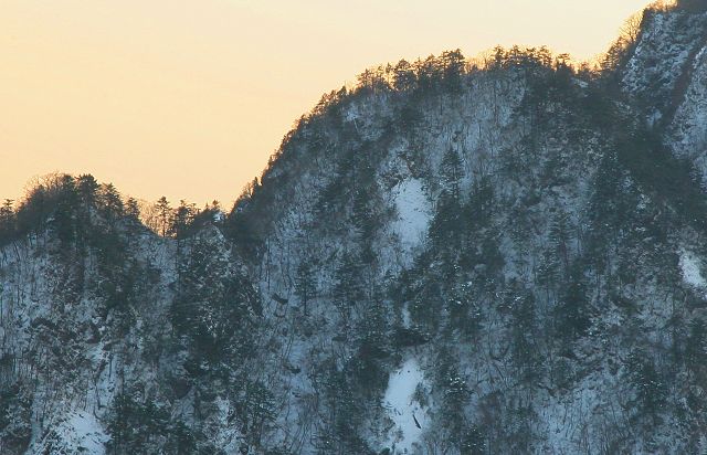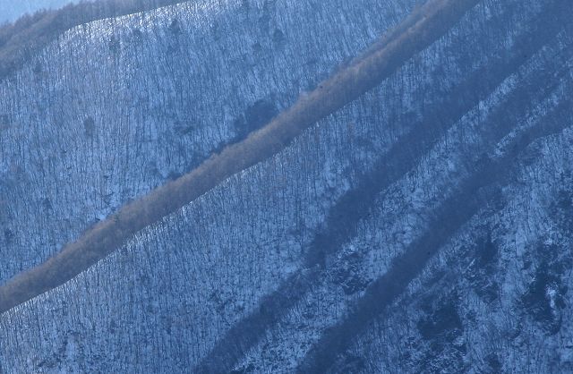 幾重にも重なった山肌、葉をすっかり落とした木々が作る美しい模様です。