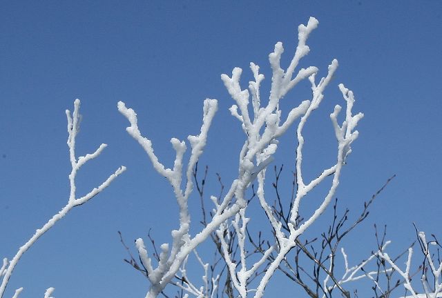 山頂とその付近の木は樹氷となり、小さな枝一本一本にも白い氷の固まりがついていました。この日は風もなく、春のような暖かさ、時折枝からパラパラと氷が落ちてきたほどです。
