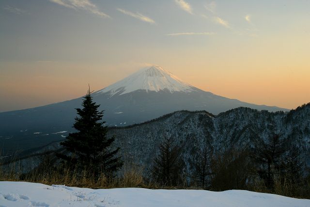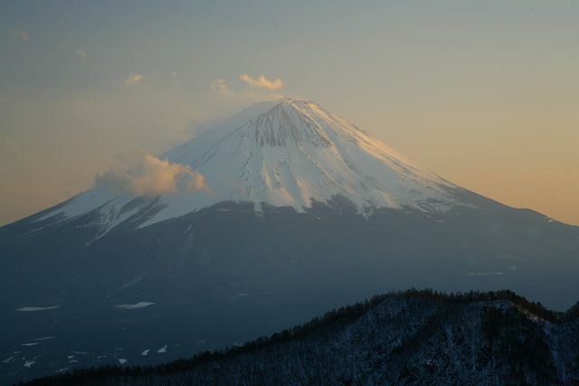 大石峠から下る前の富士山です。オレンジ色の光の中に浮かび上がります。もう少しいたい気持ちを抑え、大急ぎで登山口まで下ります。半分ほど下りて来ると、河口湖畔の家々の明かりが灯り始め、登山口に着いた時、澄み切った空には半月と瞬く星がありました。