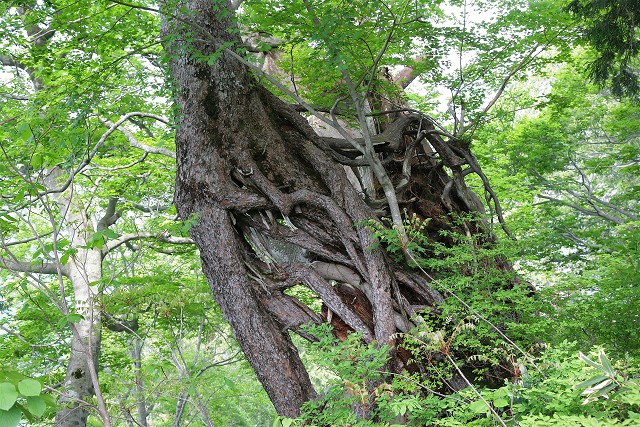 登山道脇の木、多くの木々の根が地上に出ていました。尾根が痩せ細ったためでしょうか?