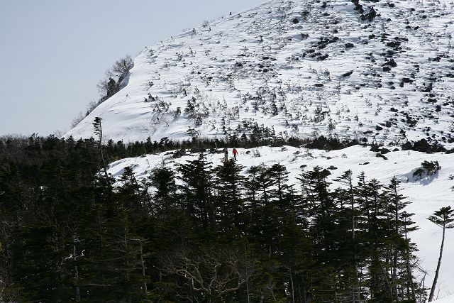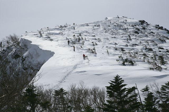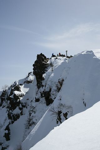 山頂はすぐ目の前です。写真の中に、ちょうど山頂に到着した私がいます。山頂の東の壁、雪庇で隠れていますけれど、痛々しく崩落しています。