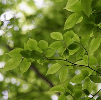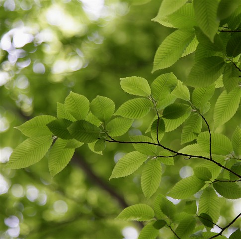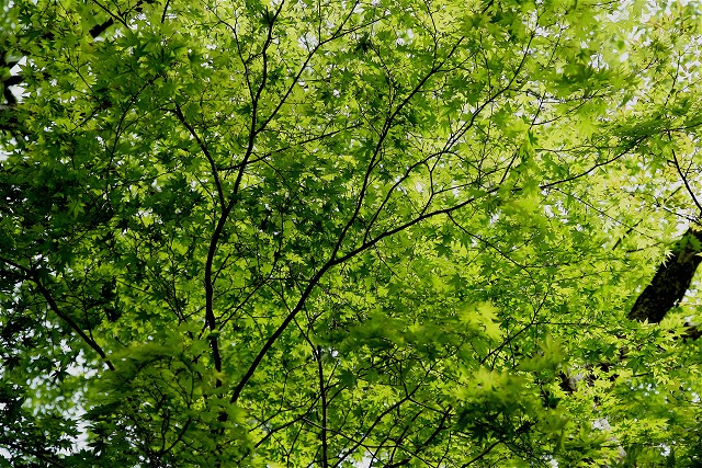 杉林を抜けて尾根道を上がってくると、モミジの新緑に加えてブナの木も若葉を茂らせていました。柔らかい若い葉に光が通ります。
