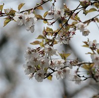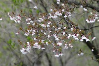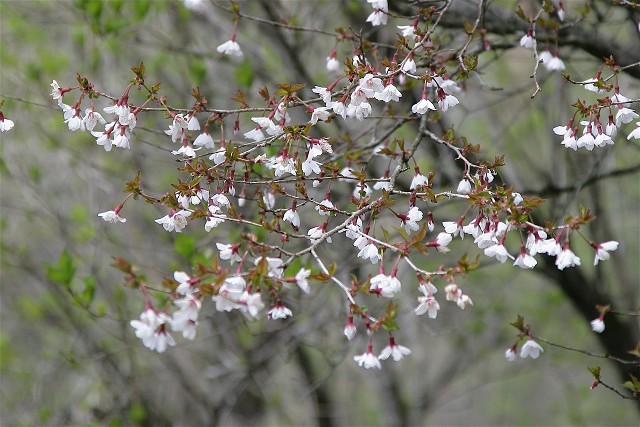 花も葉も小さくてかわいい桜です。花は下を向いて控えめに咲いています。