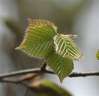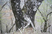 稜線はブナの林です。まだほとんど葉をつけてないブナの大木が多かったのですが、中には写真のように芽吹いたばかりの小さな葉をつけているブナもありました。