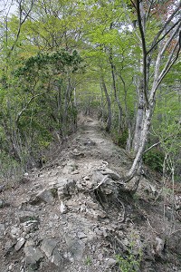 登山口の二股付近のモミジです。モミジの若葉が茂り黄緑一色の尾根道を登ります。少し行くと、杉林とモミジや他の木々の尾根道を交互に繰り返して登って行きます。