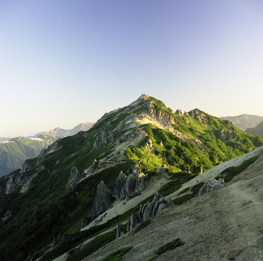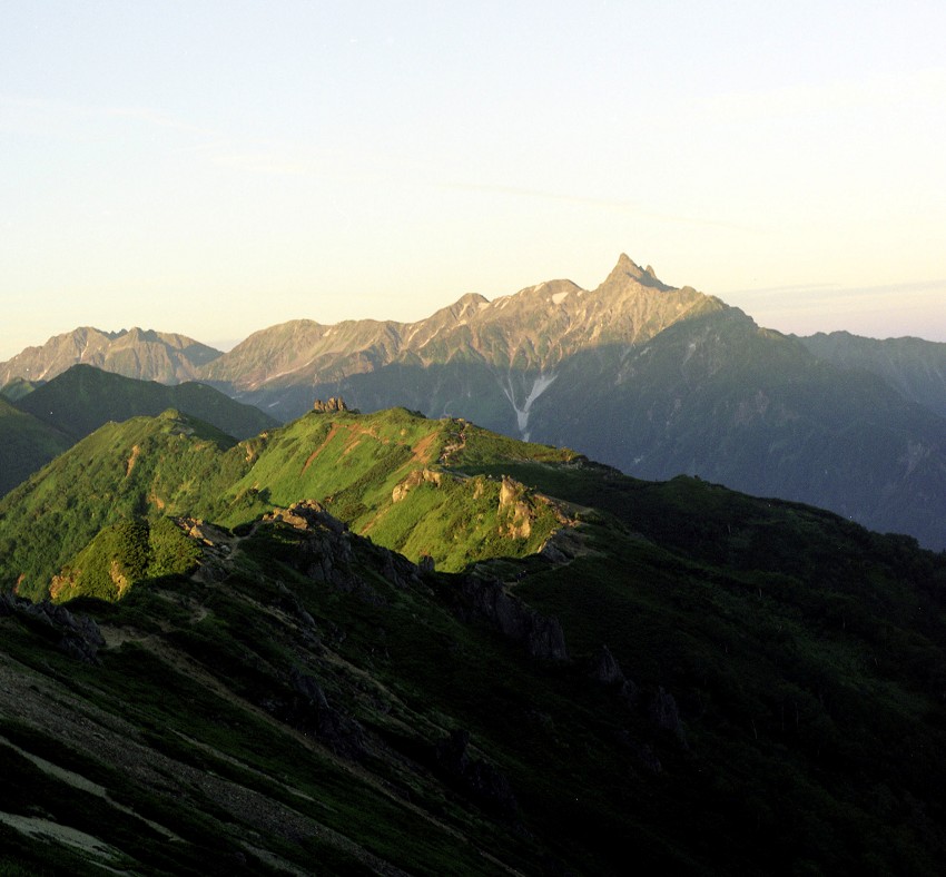 燕山荘裏から朝日を受ける槍ヶ岳と穂高の峰です。大天井から槍までの東鎌尾根は多くの登山者を魅了しています。