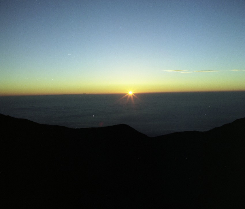 翌日はすばらしい夜明けを迎えました。日の出もこの通り、雲海の彼方の雲の中から日が昇ってきます。