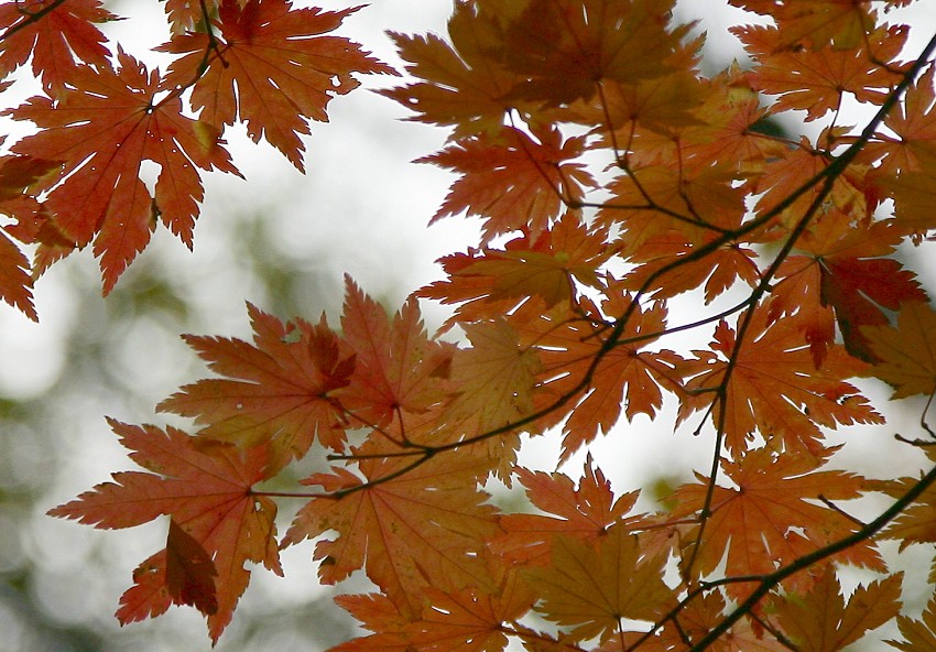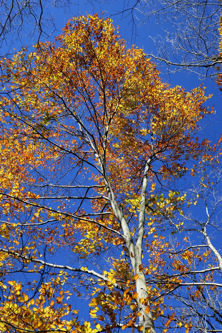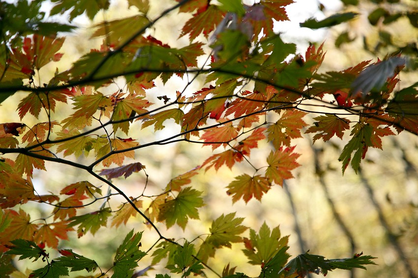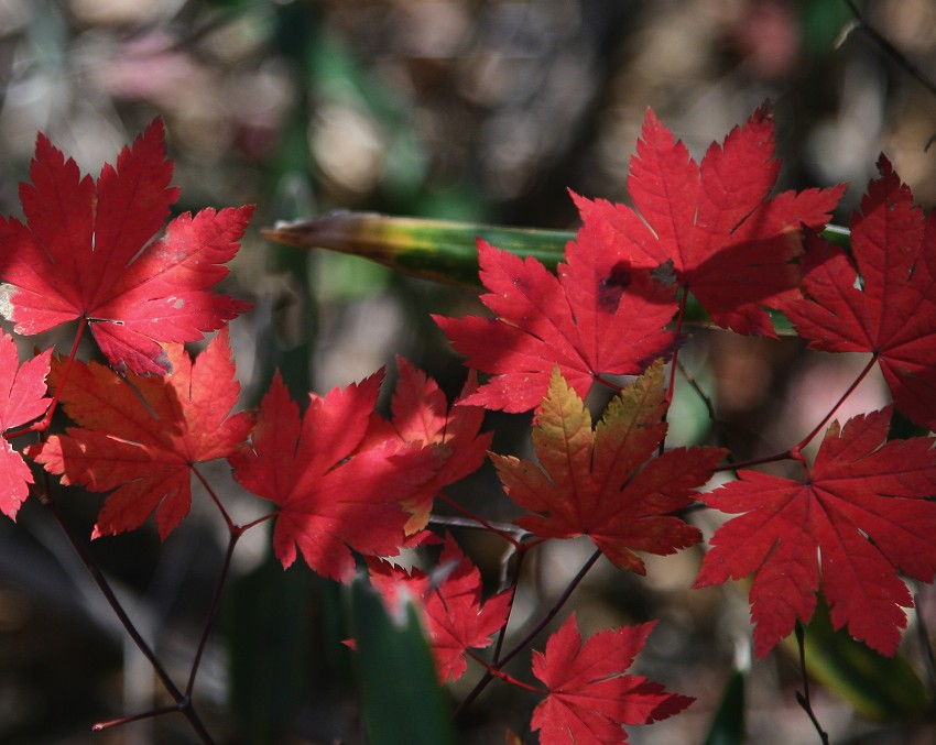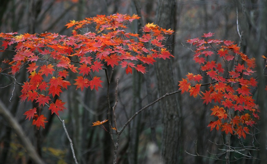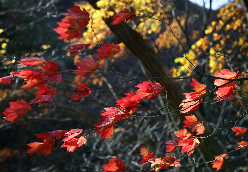 痩せた細い稜線を進むと、目を奪う真っ赤なモミジがいたるところにありました。この辺りの他の木はもう葉を落としたものもあって、上から徐々に秋が下りて行きます。