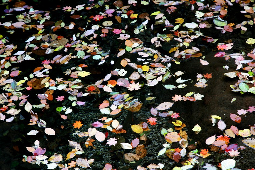 流れのあちこちの小さな水溜りには色とりどりの落ち葉が浮いて、かわいい秋模様を作っていました。