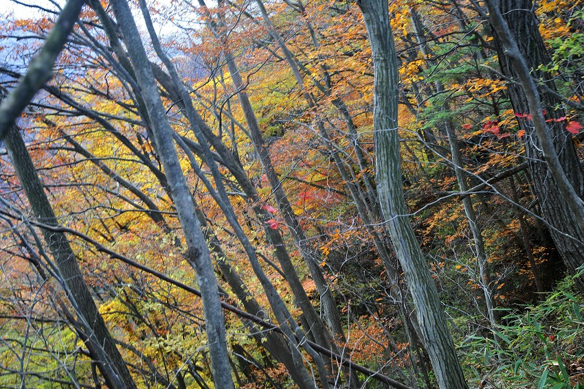 急な斜面を落ち葉に足を取られながら下りてきました。だんだん紅葉もまだこれからという木が目立ってきました。緑の葉をつけた木が目立ってきて、杉林の中を下って行くと民家が現れて、橋があるところに出ました。登山口から2時間ほどで丁須の頭に着きました。稜線歩きは1時間半ほど、三方境から入牧橋まで1時間半かかりました。
