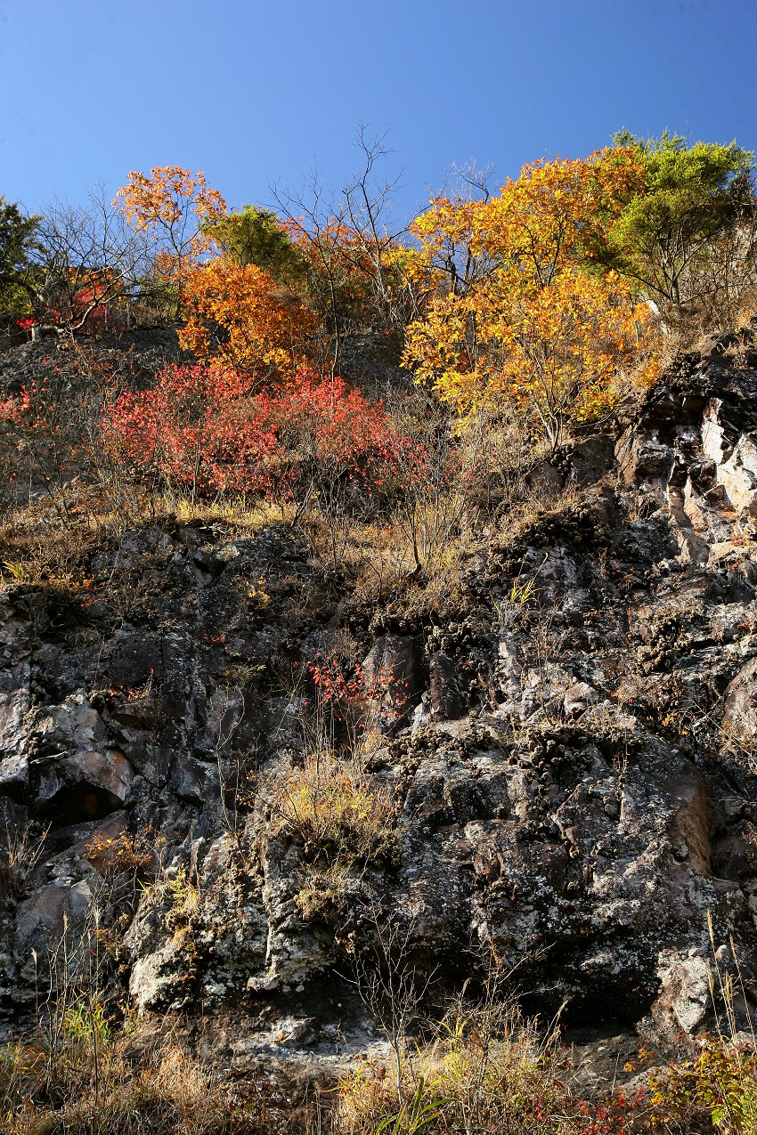 聳える岩を見上げると、やはり美しい紅葉が岩を彩っていました。
