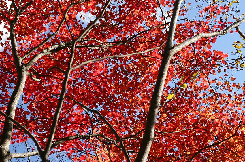 空を覆っていた雲も強い風に飛ばされてしまったようです。青い空に映える真っ赤なモミジでした。