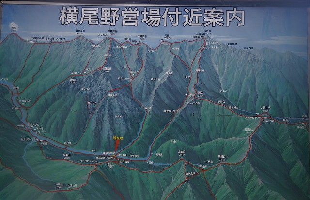 沢渡を5時に出発、タクシーで上高地に入りました。ノコンギクやキツリフネなどが咲く梓川に沿った11kmの道を横尾までやってきました。横尾にこんな地図があったので見ると、分かっていても1500mの標高差を一気に登るのは大変そうです。