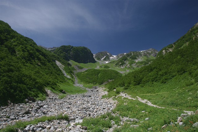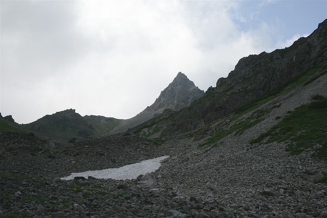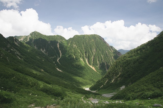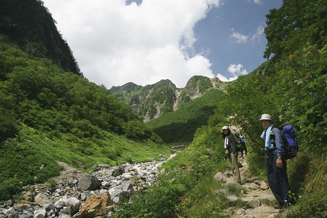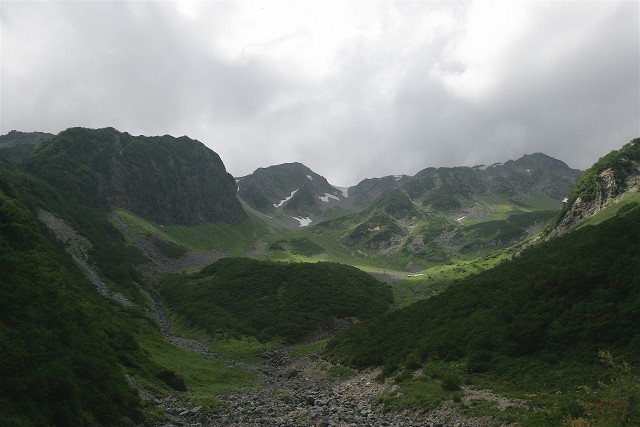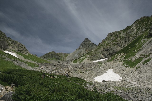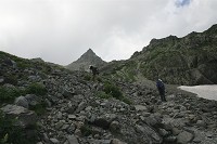 前日よりも陽射しが照りつける中、大曲り付近まで下ってきました。振り返るともう槍は見えなくなりました。