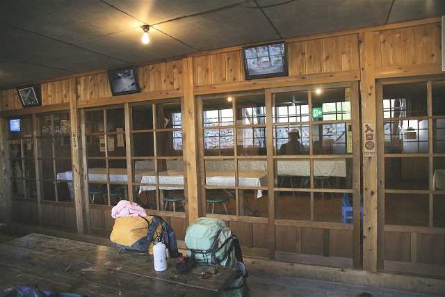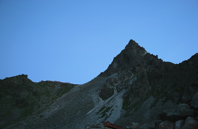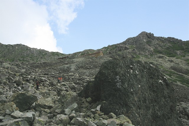 この大きな黒岩と書かれた岩の向こうに小屋が近づきました。後少し、残っている力を振り絞って登ります。4時半、やっと殺生ヒュッテに到着しました。
