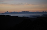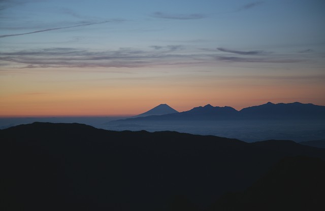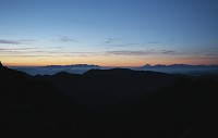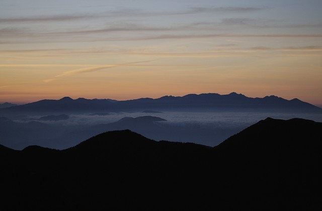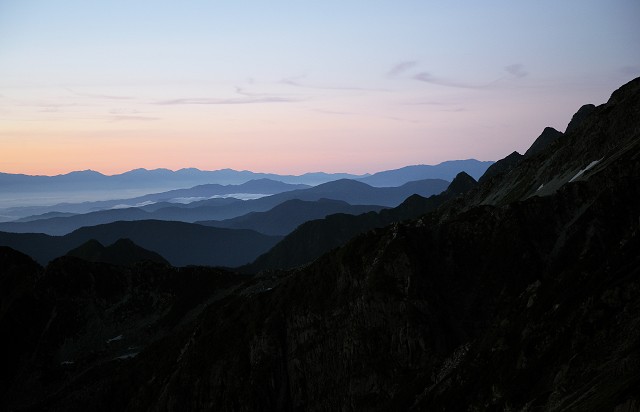 静かで快適な山小屋で一夜を過ごしました。朝5時に外に出て見るとこんなにすばらしい朝焼けの空と山々でした。殺生ヒュッテからは東鎌尾根が邪魔をしてご来光を見ることができませんが、朝の太陽の光を受けて輝きだす山々や空があまりに美しく感動しました。