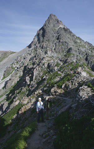 槍も泊まるはずの殺生ヒュッテも見えているのになかなか近づきません。疲れきった足にはきつい最後の登り、頑張ります。