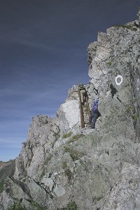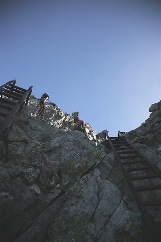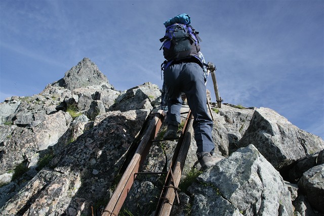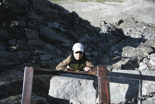 以前の記憶より急な岩場を登って行きます。ピンや梯子を頼りにぐんぐん登って行き、最後に垂直に近い梯子を2本上ると山頂でした。