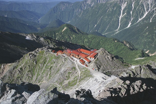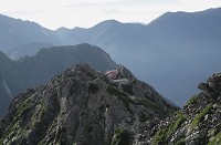 東鎌尾根の上に建つヒュッテ大槍の前に立つ登山者たち、この美しい景色に感動していることでしょう。